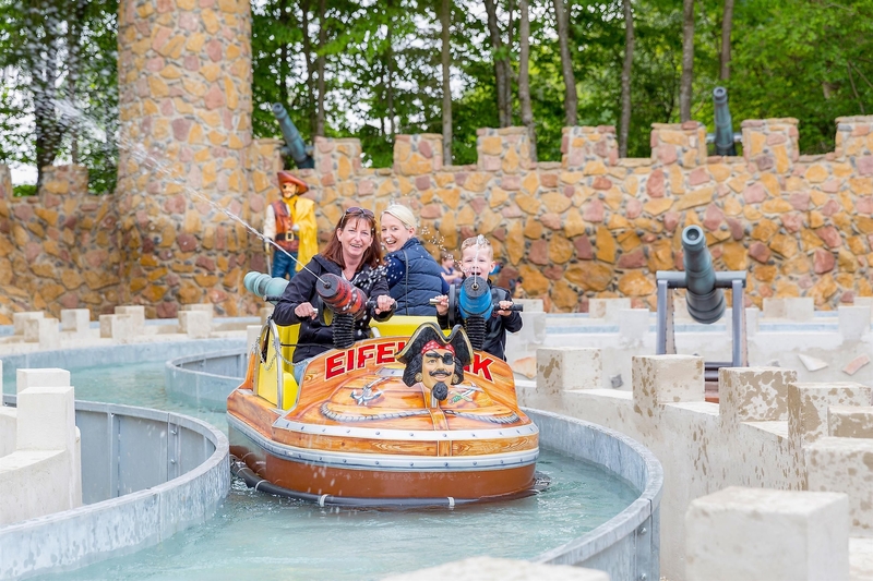 Other highlights among the rides include the lightning-fast rollercoaster Captain Jack's Wild Mouse, the world's first pirate cannon ride, chain carousel, family rollercoaster, wild water traffic circle, pony express, Gondorf pirate battle and the two bumper cars for children and children at heart. Even the little ones can have fun: the construction site ride, the mini test track or the Eifel slope can be ridden from the age of 2. At the puppet theater, young and old fans can experience exciting adventures with Punch, Robber and Purzel.